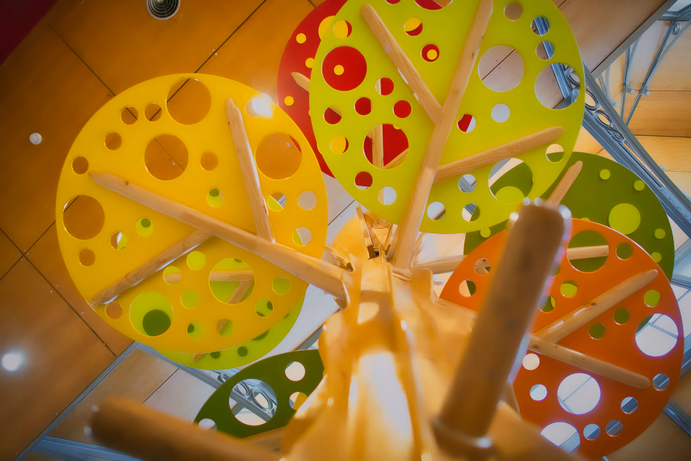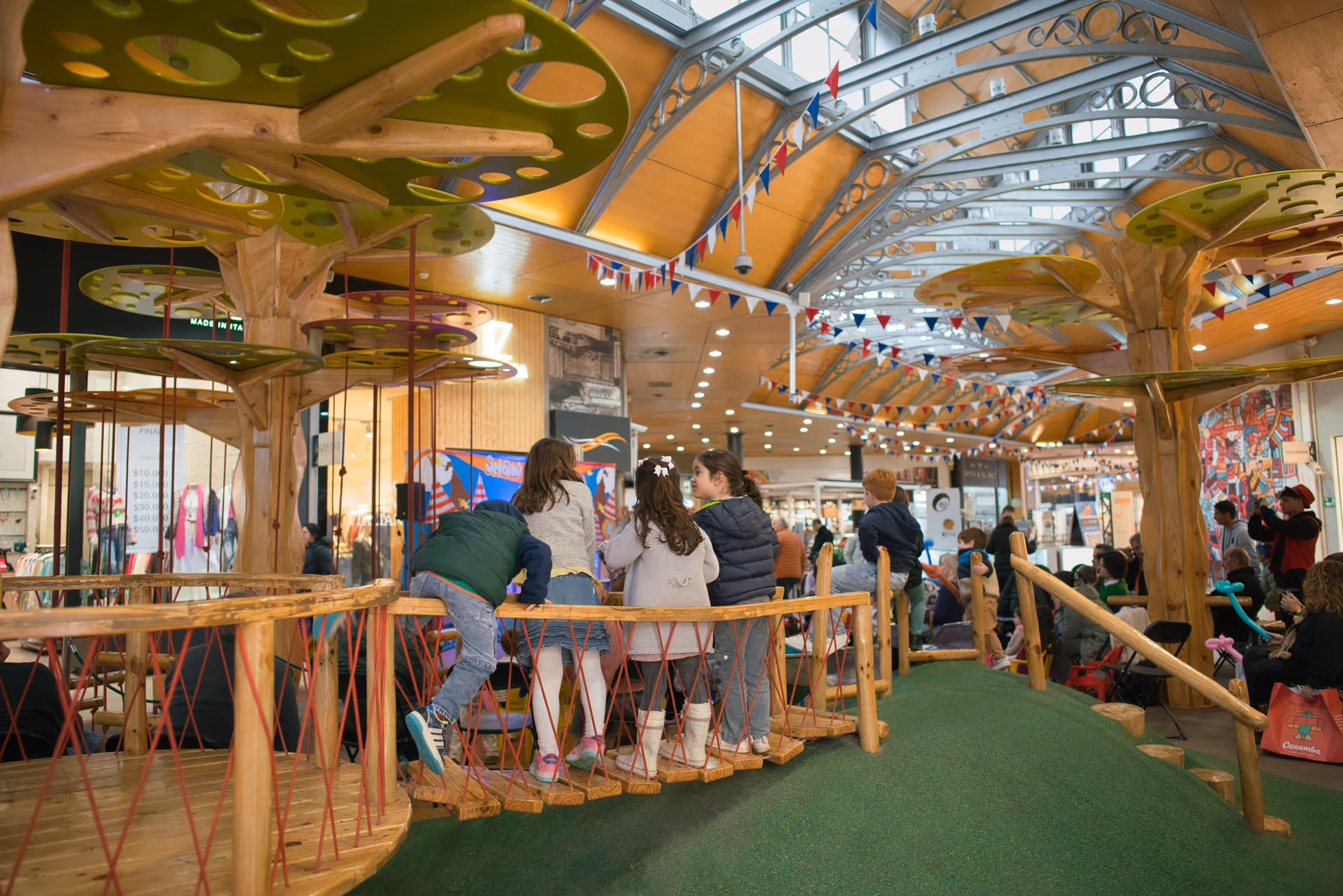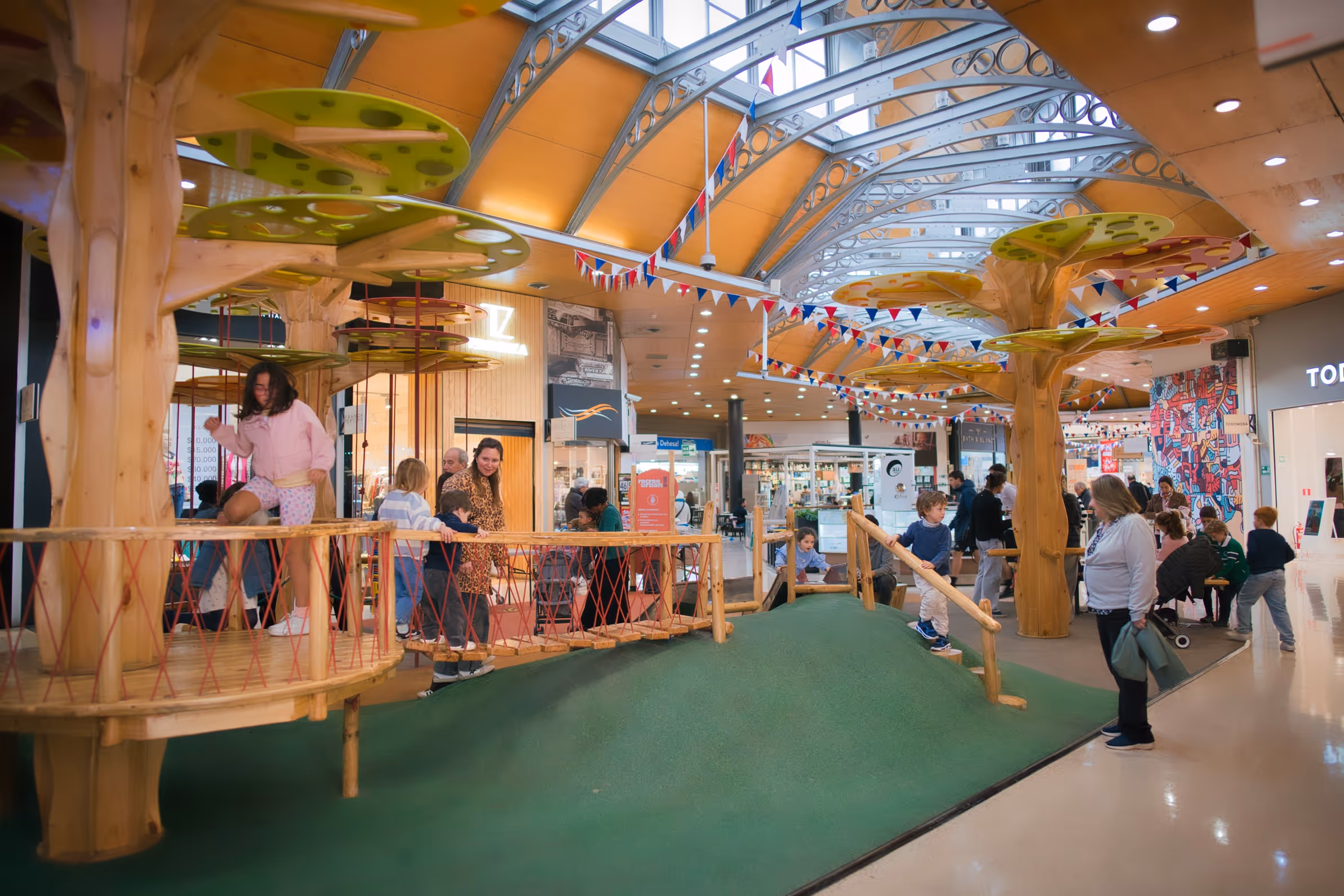 Instalación interior de juego que transforma un espacio comercial en un paisaje habitable inspirado en árboles. Estructuras de madera sostienen plataformas que promueven exploración vertical, movimiento y juego colectivo, creando un entorno seguro donde la arquitectura se convierte en experiencia.