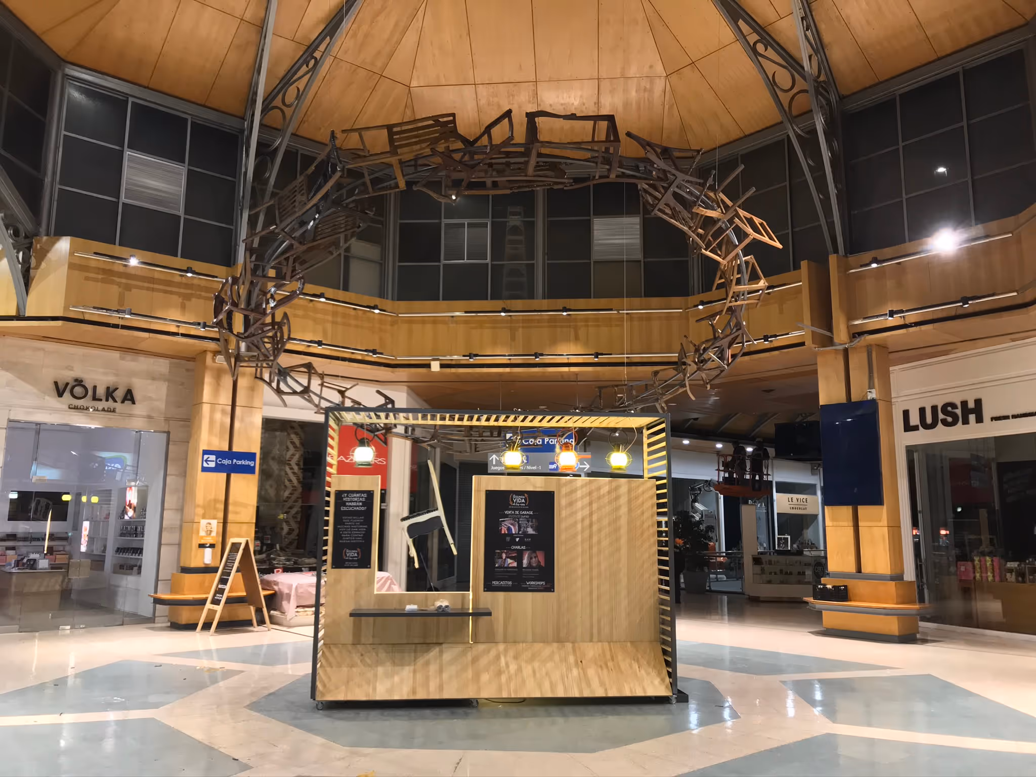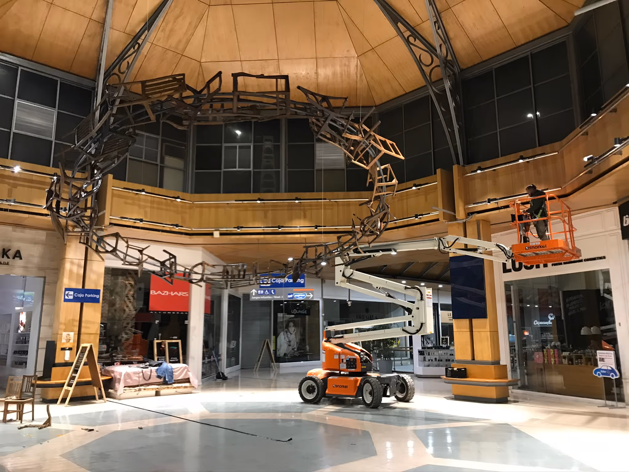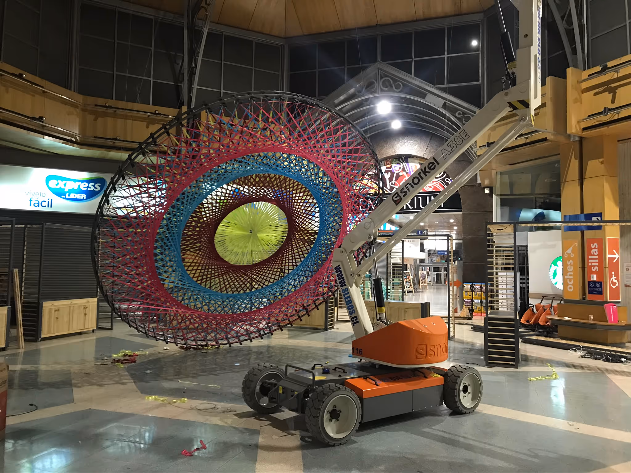 Instalación efímera de gran formato que utiliza una envolvente de cintas reflectantes para fragmentar el espacio. Mediante una estructura ligera suspendida, la obra crea un juego cinético de reflejos y transparencias que altera la percepción del entorno, generando una experiencia inmersiva y dinámic