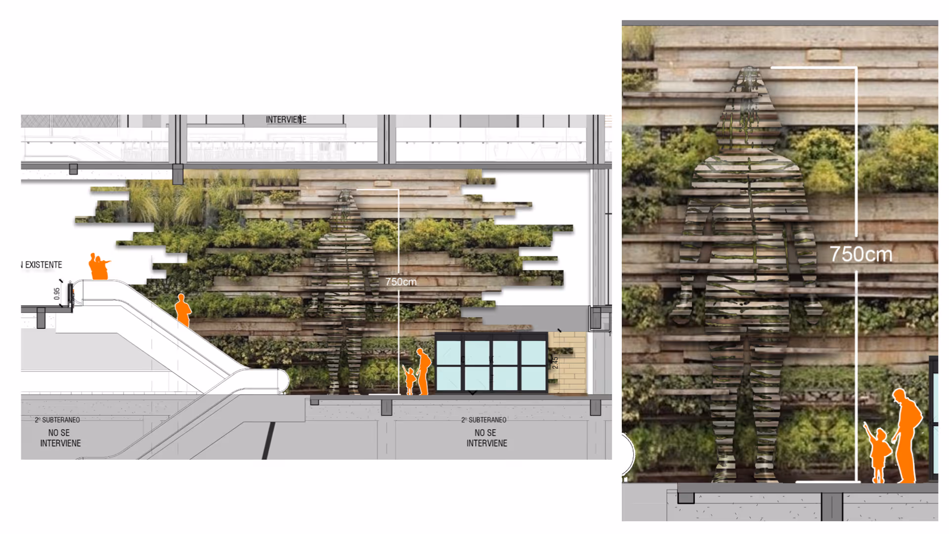 Intervención de muro interior a gran escala que combina jardinería vertical con estratos de madera horizontal. Integra naturaleza, materialidad y narrativa, formando la silueta de una figura humana que emerge desde el muro como un vacío.